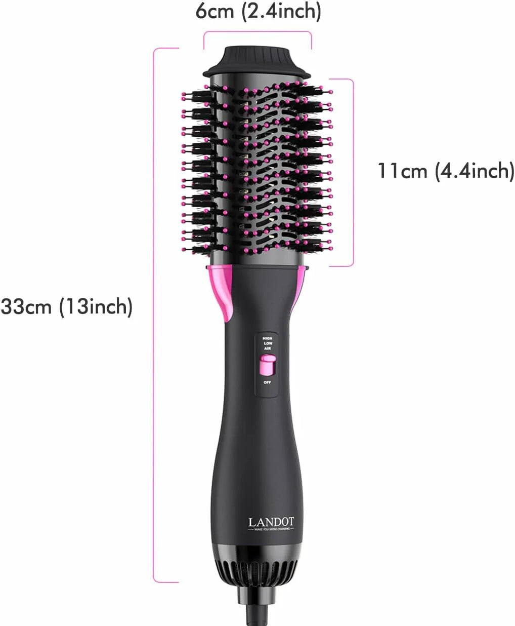 - Styles, dries, and volumizes hair in one easy step.